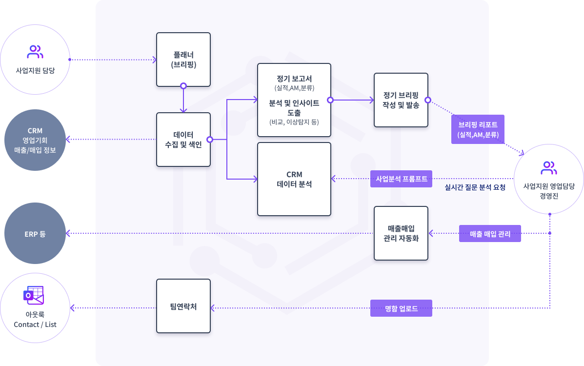 'AI 사업지원 직원'은 CRM 및 ERP 시스템과 연동하여 전 과정을 자동합니다. 시장 동향을 분석해 신규 영업 기회를 제안하고, 계약서 초안 작성, 계약 리스크 분석, 매출/메일 데이터 자동 집계, 경쟁진 브리핑 자료 요약 등을 수행합니다.
