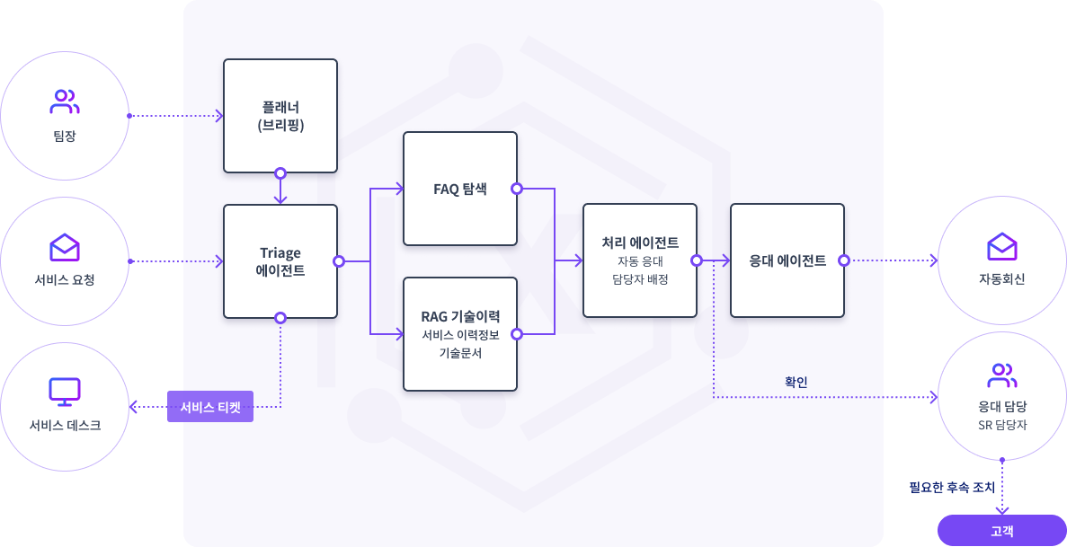 'AI 헬프데스크 직원'은 서비스 요청을 자동으로 분류하고, RAG 기술을 활용해 FAQ 기반의 단순 문의에 즉시 답변합니다. 계정 생성, 권한 부여 등 규정이 명확한 일반 요청은 승인 절차와 연계하여 자동으로 처리합니다.