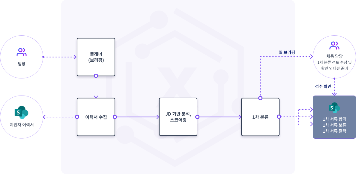 다수의 이력서 검토에 많은 시간이 소요되며, 평가 과정에서 발생할 수 있는 편향의 위험 존재. 신규 입사자 온보딩 절차가 복잡하고 부서별로 일관성이 부족.