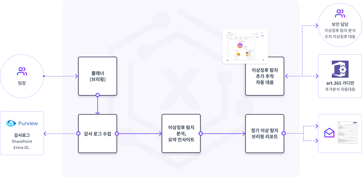 방대한 양의 보안 로그(M365 Purview 등)를 수동으로 모니터링하는데 한계가 있으며, 정교한 최신 위협을 신속하게 탐지하고 대응하기 어려움.